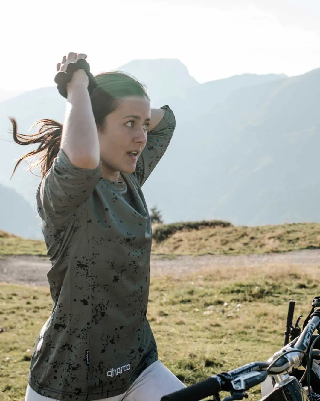Made from 100% recycled polyester. The fabric is breathable and wicking, but nice and resistant to hold up on the trails.